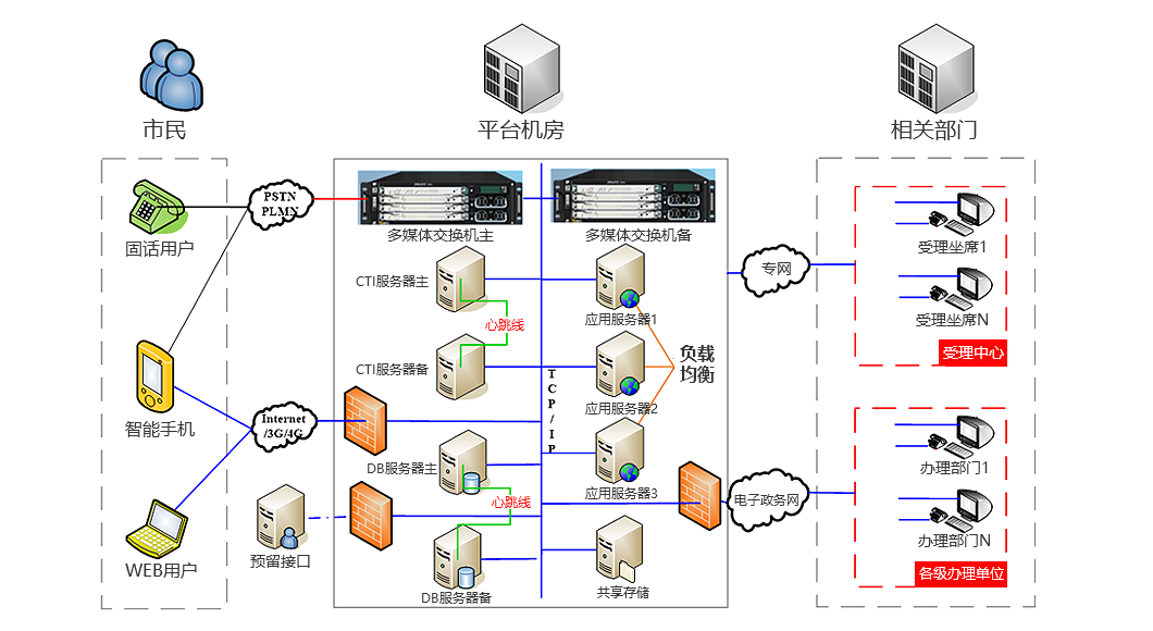如此,在實現(xiàn)對市民意見、問題求助、建議、投訴、表揚等各類民生信息進行廣泛收集、高效分析、及時處理、及時回復的同時,通過現(xiàn)代科技手段和信息技術提高政府服務熱線對市民的服務的能力。系統(tǒng)組網(wǎng)示意圖